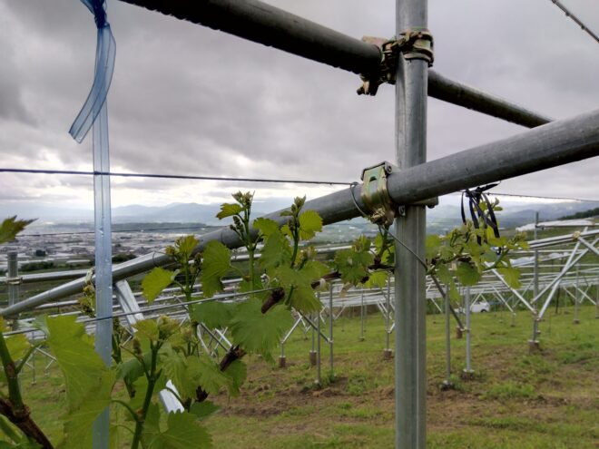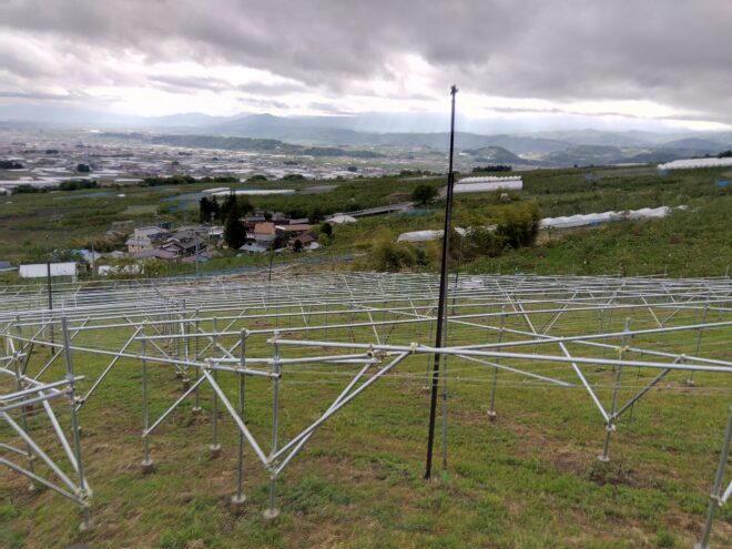 今回ぶどう棚の建設にあたり、園主と園主の妻の二人と述べ3日ほど+1人で建設できました。研修で行った畑等も合わせると1ヘクタールほど建てましたがまだまだ素人、、、。真っすぐのはずが「あれ?曲がってる?」って個所もなん個所か。多少棚が曲がってても露地栽培ならぶどう作りに影響ないし、良いぶどうができるかは別問題。安全に丈夫で使い安くできるだけお金をかけずにできたらいいですね。