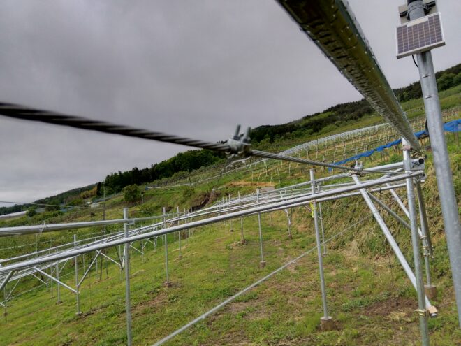 ②2.5mあれば簡易雨よけを載せても余裕がありますし、スピードスプレイヤーで通ることもできます。主幹を通す側のパイプ(斜面に対して横のパイプ)を高い位置に置くことによって新梢を誘引する時に邪魔になりません。