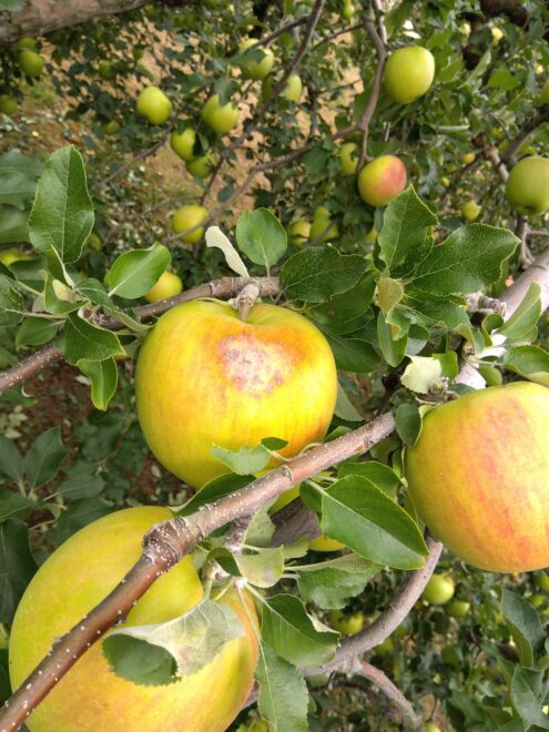赤系りんごと違って青系りんごは葉摘みはしません。色で商品価値が変わりませんし葉摘みでりんごの味が変わることもありませんので。ただ赤系品種で見分けれれた「芯腐れ」を見分けるのはとても困難です。色や香り熟度なんかで見分けて行きます。農協や大きなりんご業者などは機械によって「芯腐れ」を選別できます。小さい農園ではそこまでの設備投資はできません。厳選し荷造りしておりますが入ってしまったらごめんなさい。