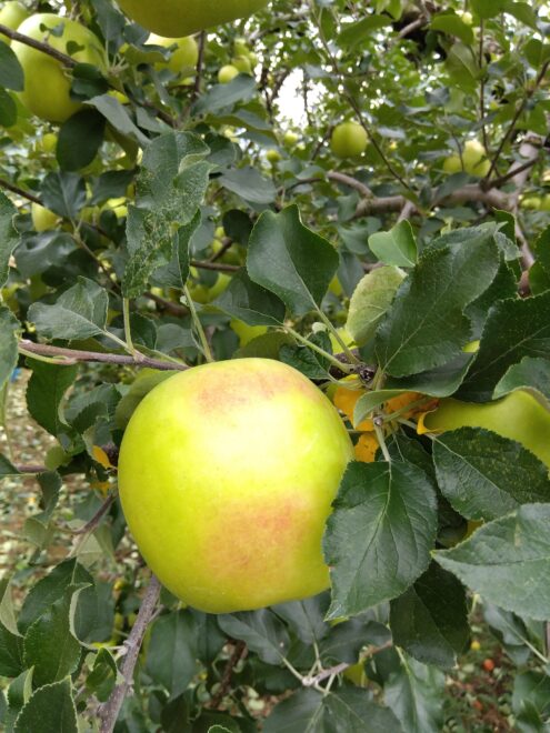 陰になっていた部分が若干緑色になっていて色ムラがあるのが分かると思います。この色ムラが果実全体に日光を当てれば無くなり真っ赤なりんごになります。