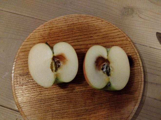 葉摘み作業中に全体に比べて赤いりんごが畑の中にはポツポツあります。これは、芯腐れと言って中が腐っています。これもついでに取り除いていきます。全部のリンゴが赤くなるころにはこの芯腐れが見分けつかなくなってしまうためこのタイミングでやるのが重要です。